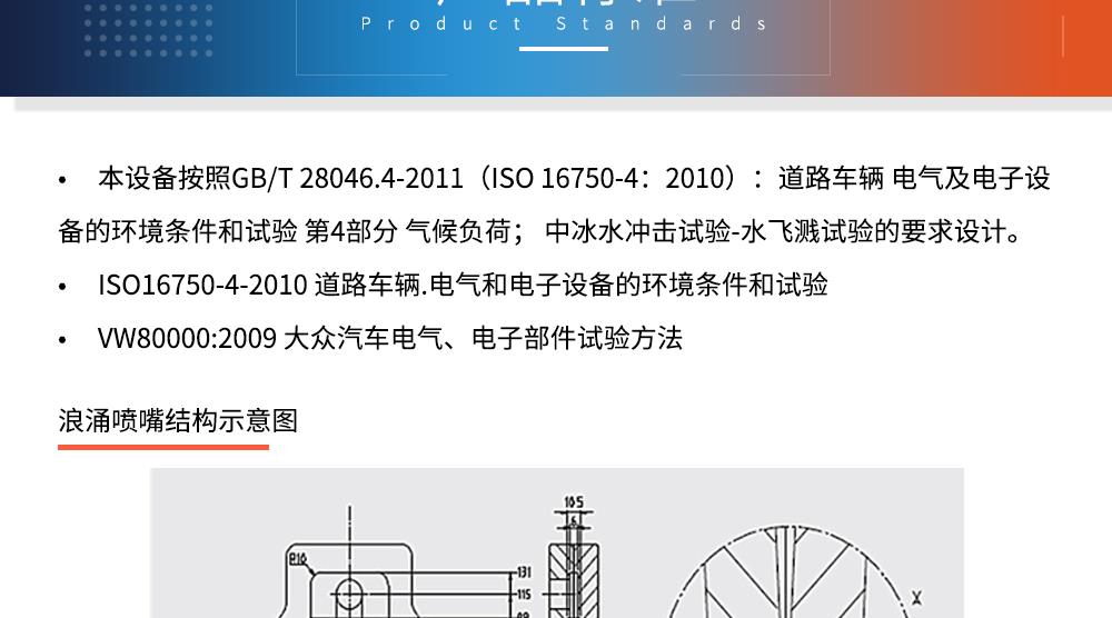 用途:冰水沖擊試驗(浪涌水的溫度沖擊試驗)是模擬部件在駛過積水時而產生的浪涌水的負荷情況,保證部件由于水而急劇冷卻情況下的功能穩定性。如車輛在冬季有水路面駕駛時冰水濺落到熱的系統/組件上,失效模式為不同的溫度膨脹系數導致的材料機械破裂或密封失效