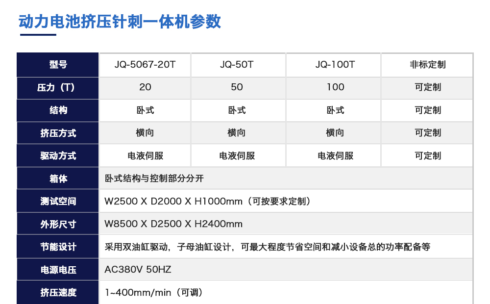 產(chǎn)品型號(hào):JQ-5067-20T(可定制) 品牌:劍 喬 用途:動(dòng)力電池?cái)D壓針刺一體機(jī)模擬各類動(dòng)力鋰電池組在使用過(guò)程中,電池包遭受擠壓的情形,人工呈現(xiàn)電池在遭受擠壓時(shí)可能出現(xiàn)的不同狀況。 原理:電池包擠壓試驗(yàn)機(jī)將電池放在連個(gè)擠壓咨詢熱線:13829135130