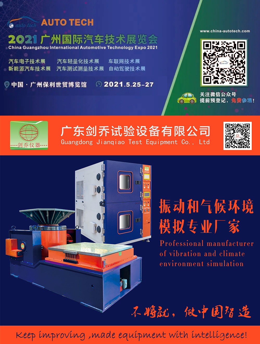 2021年5月25-27日,廣東劍喬試驗(yàn)設(shè)備有限公司【劍喬儀器】將攜旗下最新試驗(yàn)設(shè)備亮相AUTO TECH 2021 中國(guó)·廣州第八屆國(guó)際汽車(chē)技術(shù)展覽會(huì),現(xiàn)場(chǎng)展示:振動(dòng)試驗(yàn)系統(tǒng)、溫濕度振動(dòng)三綜合箱、高低溫防爆試驗(yàn)箱、高加速?zèng)_擊試驗(yàn)臺(tái)、電池?zé)釣E用試驗(yàn)機(jī)、電池短路試驗(yàn)箱、等試驗(yàn)設(shè)備及動(dòng)力電池相關(guān)試驗(yàn)解決方案。