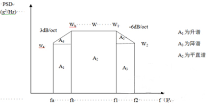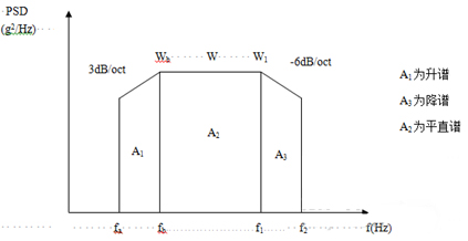 為了簡便起見,往往將功率譜密度曲線圖劃分成若干矩形和三角形,并利用上升斜率(如3dB/oct)和下降斜率(如-6dB/oct)分別算出wa 和w2,然后求各個(gè)幾何形狀的面積與面積和,再開方求出加速度總均方根值。