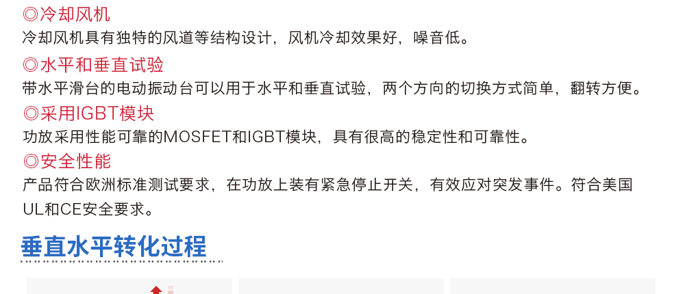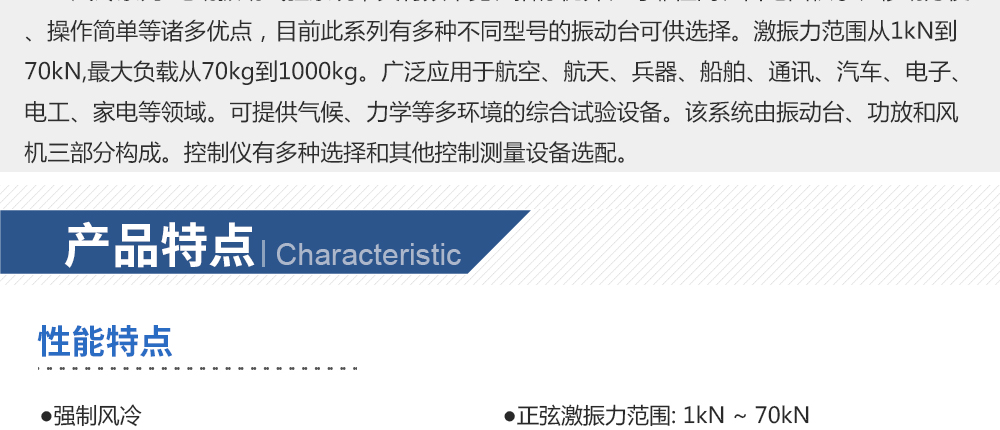 用途:風冷電動振動系統,推力大,承載能力強,冷卻效率高。可分別完成三軸向的正弦振動試驗、寬帶隨機振動試驗以及經典(半正弦、梯形、后峰齒)脈沖和沖擊響應譜試驗。